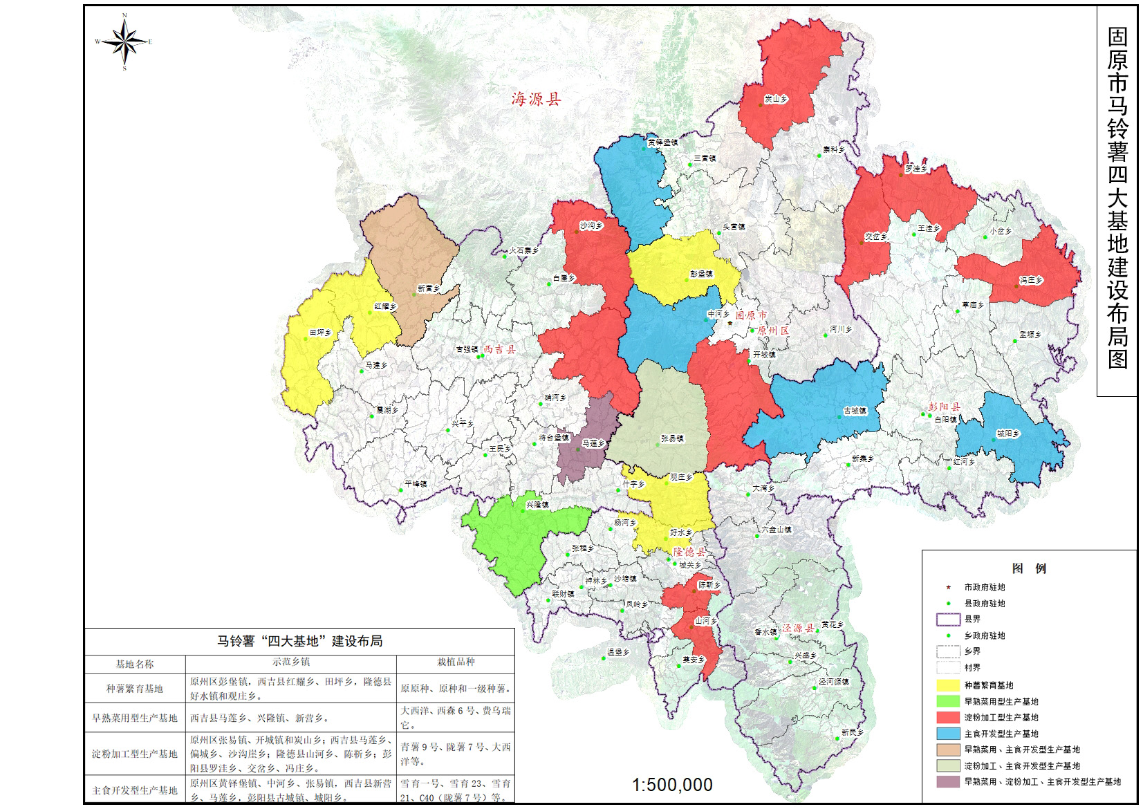 (三)打造全国马铃薯种薯繁育、标准化生产和精深加工基地。坚持种薯繁育、鲜薯外销、淀粉加工、主食开发四业并举,积极构建内联国内、外接亚洲、东南亚市场的农产品贸易流通体系,逐步形成以原州区马铃薯制品加工为中心,建立东到黑龙江、西到新疆、南到广东、北到内蒙,辐射周边甘肃、陕西等地原料生产基地,打造全国马铃薯加工集散地,扩大薯条、薯片、薯饼等出口规模,擦亮中国马铃薯之乡金字招牌,建设六盘山马铃薯产业集群。