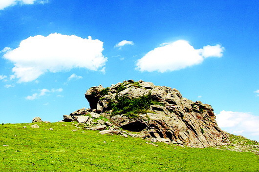 秦人远去了,只留下那些让后人至今怀想不已的地名,诸如石鼓山、景墩梁、牧马梁、上店子、下店子、大卜峪、瓦泉峪等,而尤以石鼓山最为著名,著名得连那部白发三千丈的《水经注》里,都记载着它的故事:“山在梧中聚,有石鼓不击自鸣,鸣则兵起。汉成帝鸿嘉三年,天水冀南山有大石自鸣,声隐隐如雷,有顷止,闻于平襄二百四十里,野鸡皆鸣。石长丈三尺,广厚略等,在崖勒,去地百余丈,民俗名曰石鼓。”石鼓山是朱圉山最高峰,海拔2625米,山峰陡峭,人迹罕至,远望如石鼓,近看似卧牛,茂林幽泉,森秀无比。初春时节,万物透绿而石鼓白雪皑皑;大雨前夕,飞鸟翱翔而山上烟云弥漫。更为神奇的是,山丘之巅,突兀一石,酷似一头卧北朝南的耕牛,翘首做犀牛望月之状,人称卧牛山。卧牛山石颈之下,有一巨石,其面圆而平,每当正午阳光直射之时,远远望去,石面宛如兽皮所蒙,恰如一面威风凛凛的巨型战鼓,恍惚之中,有如雷声隐隐而来,民呼之曰石鼓,石鼓山因此得名。石鼓山素来以厚重的人文历史和优美的草原风光而著称,尤为闻名的“石鼓擎雪”,自古就是“甘谷八景”之一。千百年来,石鼓山甘愿舍弃繁华,远离人世,在淡泊宁静的岁月中,固执而坚定地守望古坡,守望古坡人家。