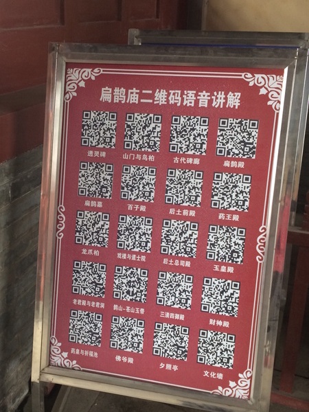 庙内早已实现wifi全覆盖,手机可以方便地上网。山门内一块告示牌立在神像前,20个二维码规规矩矩地排列其中,上面一行字“扁鹊庙二维码语音讲解”。每个二维码对应着一个景点,透灵碑、山门与鸟柏、古代碑廊、扁鹊殿、百子殿、玉皇殿、夕照亭、文化墙……只需用手机一扫,便可听到非常清晰的导游语音。