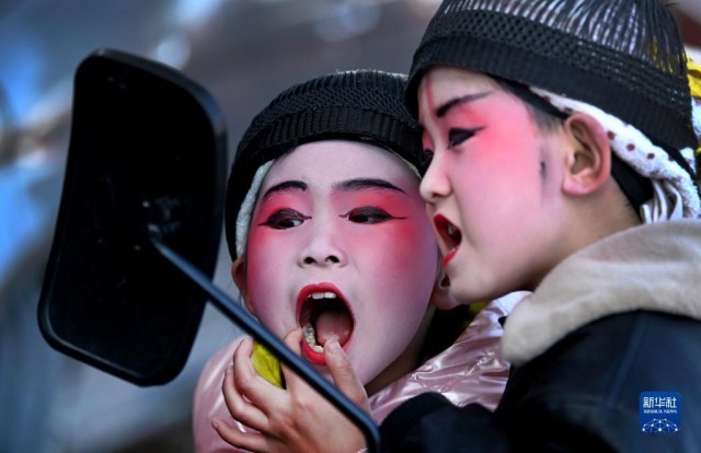 2月19日,西安市临潼区栎阳街道卷子村参加“背芯子”表演的两名小朋友查看自己的化妆效果。