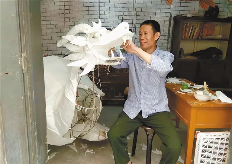 每次制作之前,胡民才都要构思好主题,反复揣摩构造,再在地上用粉笔画出所表现形象的轮廓,依据轮廓将主骨架扎出来,填充完善细节,之后在表面糊上一层宣纸。“这道工序一定要心细、手灵活,干得多了,自然就摸索出来方法了。”胡民才介绍,“之后在上面刷上一层白矾水,既可以让纸变得平整,又可以保证上色时不晕染。颜料的选择尤为关键,透光性能好,才能在夜晚点亮时色彩鲜艳。”