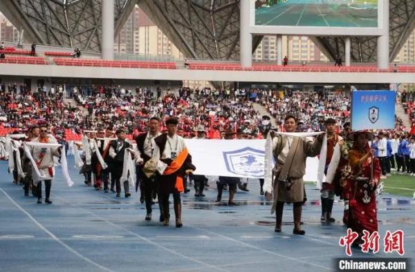 图为开幕式现场,果洛格萨尔队入场。马铭言 摄
