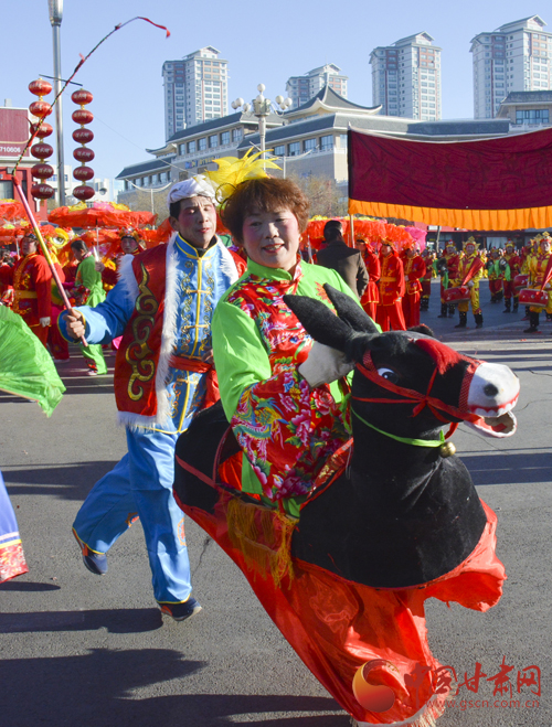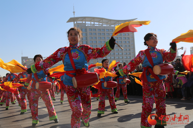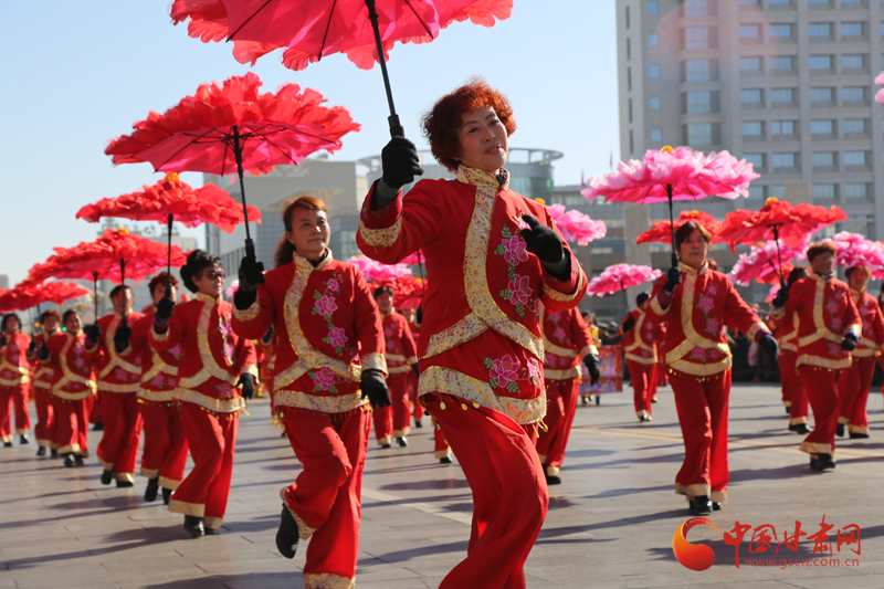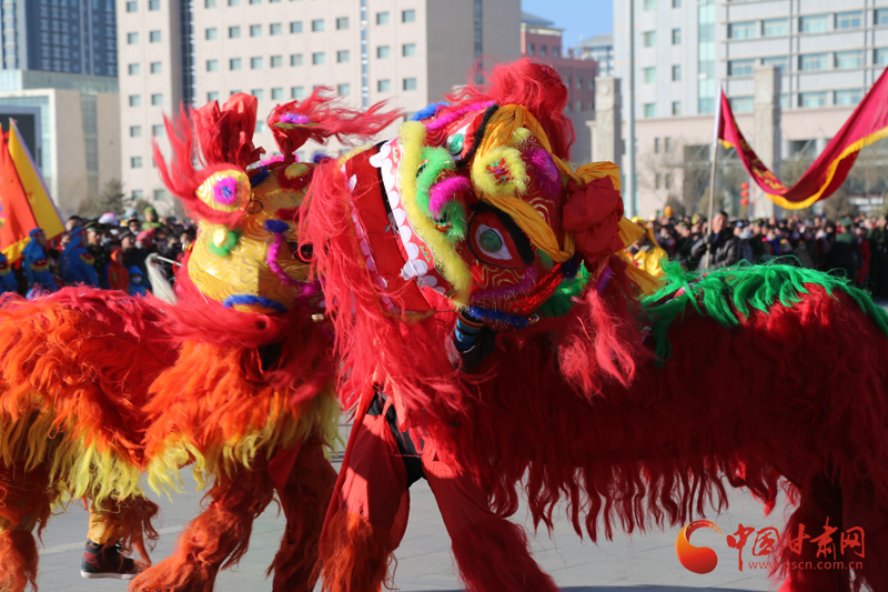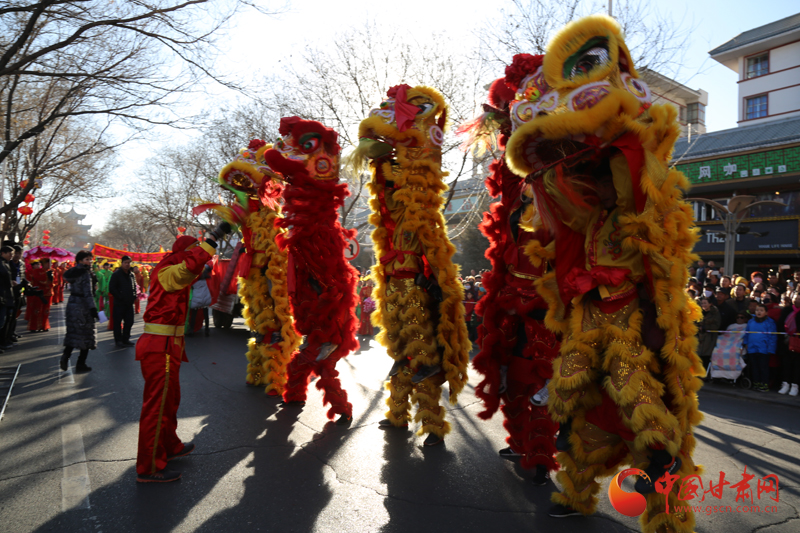 9点48分,击鼓仪式开始。随后,震耳欲聋的威风锣鼓轮番登场,时紧时缓的鼓点犹如滚滚春雷响彻大地;花团锦簇的旱船引人注目,赶船姑娘身着彩裳尽显婀娜;一头头威武的狮子腾挪跳跃,一条条长龙上下翻腾,仿佛在云中穿梭,灵动自如。此外,社火表演队带来的“地蹦子”、“福禄车”、“赶驴”等省级非物质文化遗产保护项目的精彩表演,让肃州老百姓过足了“社火瘾”。