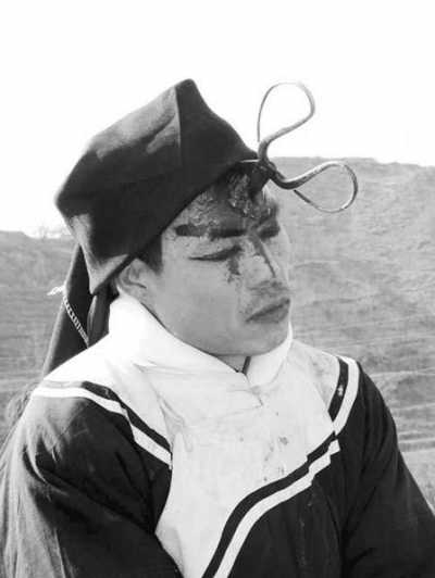 陕西省宝鸡县赤沙快火造型,恶人或被锄头砸进脑袋,或被剪刀扎进面门——置恶人于死地的是清一色的农具,增加了乡土气息。