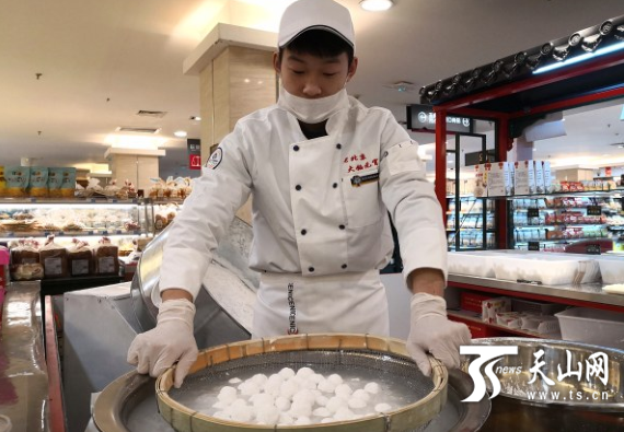 销售台前,顾客可以直接看到元宵制作的全过程:制作人员将小方块形状的固体馅料放在水中快速浸湿,再扔进转动的机器中,直到馅料裹上一层厚厚的糯米粉。浸湿和裹粉需要人工操作,反复3次,一个个圆滚滚的元宵就做成了。