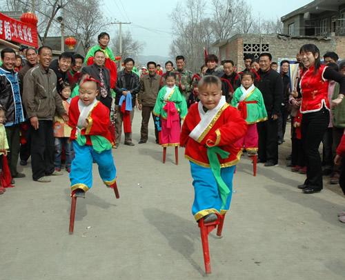 高跷,是舞蹈者脚上绑着长木跷进行表演的形式,技艺性强,形式活泼多样,由于演员踩跷比一般人高,便于远近观赏,而且流动方便无异于活动舞台,因此深受群众喜爱。