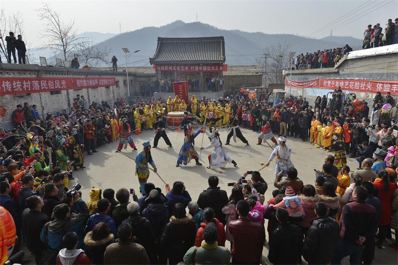 今天(2月3日)是正月初三,每年春节至元宵节,是河北井陉桃林坪一年之中最热闹的时候。爱好花脸社火的群众每到此时都画上脸谱,身着戏装,真刀真枪进行表演。社火是春节期间的一种民俗娱乐活动,在我国北方各省份广为流传。与其他地方的社火不同,这里表演社火的每个演员脸上都画着脸谱。桃林坪村的花脸社火已经传承了700多年,今天,就随小编听一听桃林坪花脸社火的故事 。