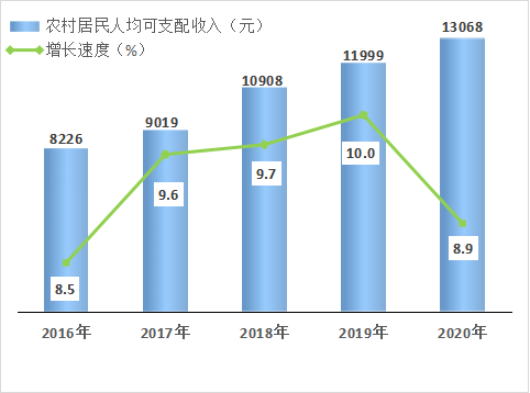 农村居民人均可支配收入13068元,比上年增加1069元,增长8.9%。其中,工资性收入7744元,增长9.0%;经营净收入3216元,增长9.4%;财产净收入43元,增长4.9%;转移净收入2065元,增长8.0%。全年农村居民家庭人均支出为10469元,增长7.1%;其中人均生活消费支出7841元,增长5.2%。农村居民人均住房面积26平方米,增长4.0%。