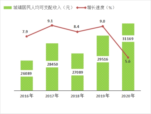 2016年—2020年城镇居民人均可支配收入及增长速度