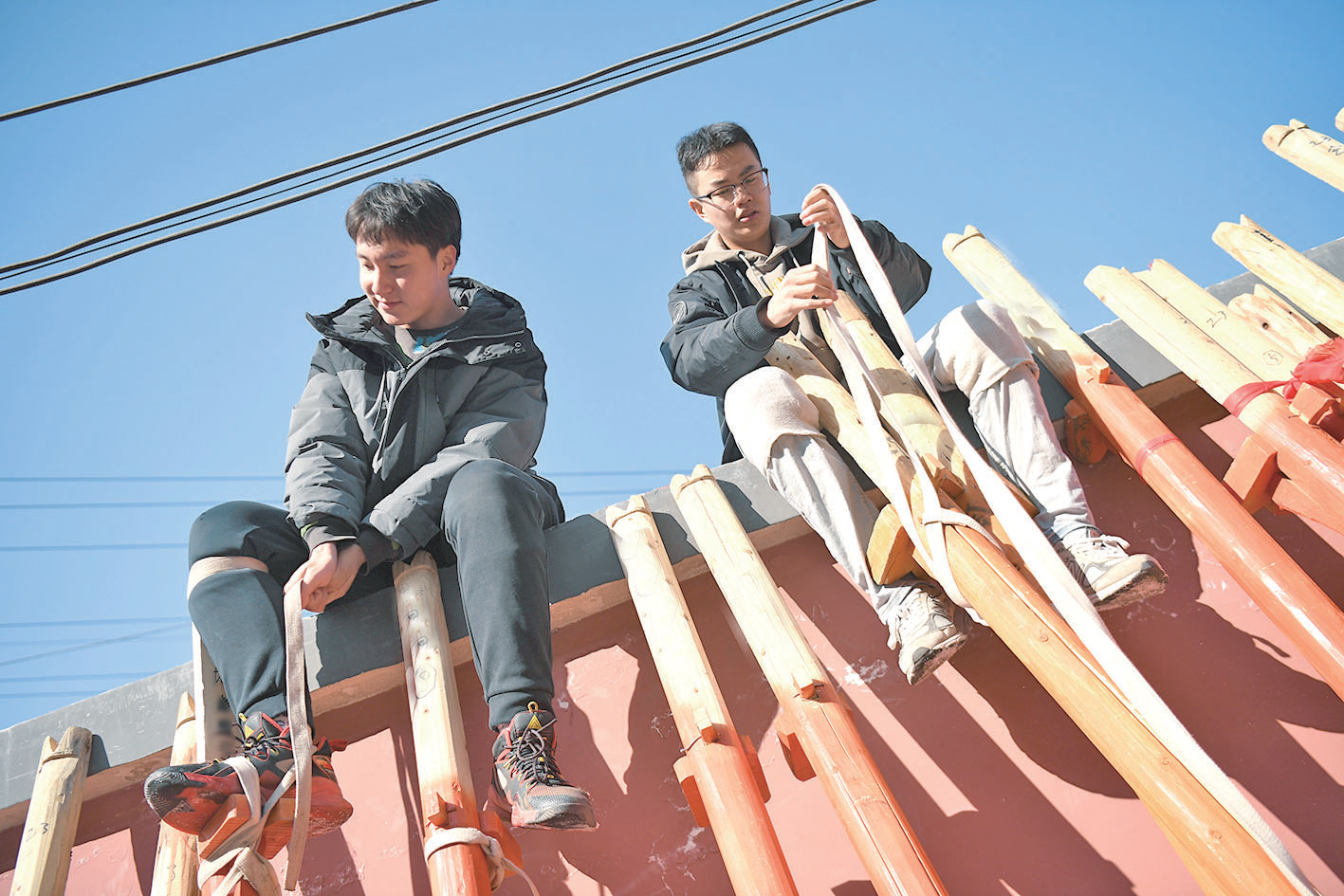 与此同时,鲁沙尔镇的小伙子们踩着两三米高的高跷,伴着“咚咚”的鼓声,正卖力地练习社火曲目。队伍中,22岁的张福臻踩着3.6米的高跷在场地内来回穿梭。张福臻表演高跷已经有7年了,多年来,他踩的高跷一年比一年高,如今已成为整个高跷队的“第一高”。