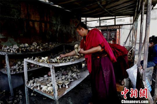 图为大佛寺僧侣正在收集被烧过的酥油灯。胡贵龙摄