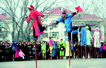 踩高跷表演引来一片叫好声。记者 周青先 摄
