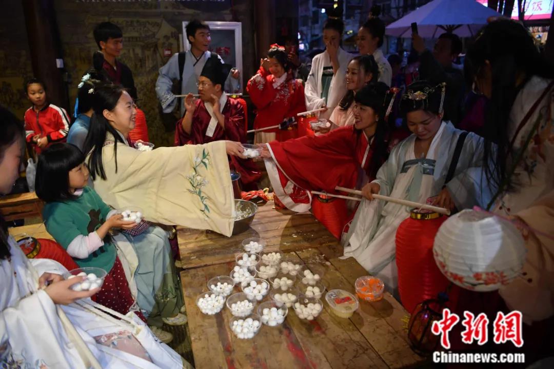 2018年3月,昆明汉服爱好者们在元宵节身着传统服饰,包元宵、猜灯谜,重现传统元宵节场景。图为身着汉服的爱好者准备吃元宵。中新社记者 刘冉阳 摄