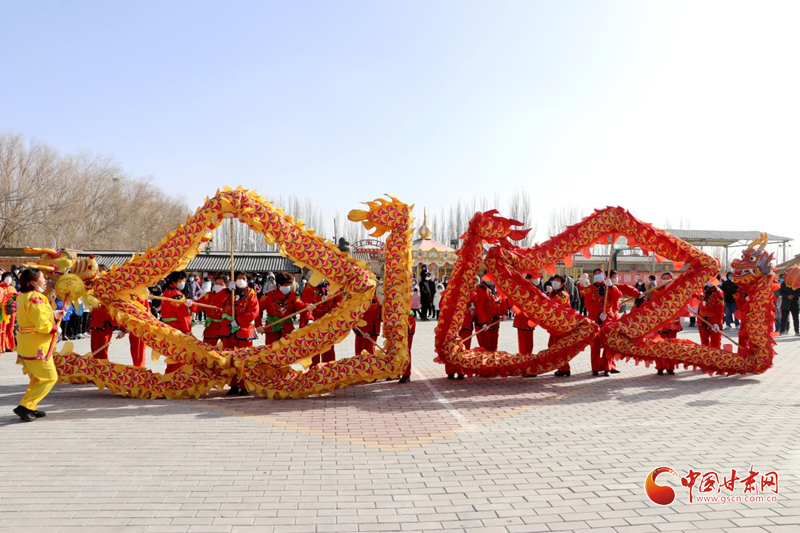 中午一点,随着一阵鼓乐声响起,社火队队员身穿喜庆艳丽的服装,头戴五彩头饰,手舞彩扇,腰系彩带,迈着整齐的步伐,和着铿锵的锣鼓声,扭秧歌,耍龙,逗趣的民间故事人物串场。鼓点时而紧凑,时而舒缓,欢乐又接地气的表演引得在场村民阵阵叫好,这一刻的民勤县沙井文化民俗旅游景区热热闹闹,浓郁的年味儿四处洋溢。