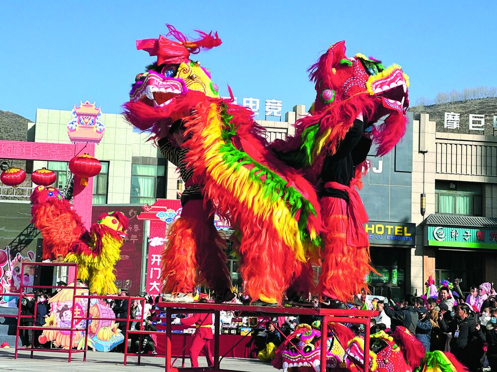 长龙祈福、金狮拜年、高跷走秀、锣鼓庆祝……身着盛装的社火队员个个精神抖擞,踏着鼓点尽情表演。威风凛凛、精神抖擞的雄狮,和着豪放粗犷的锣鼓声摇头摆尾、欢腾跳跃。憨态可掬的大头娃娃、翻飞的彩扇、华丽的旱船……花样繁多的社火表演,大家看得津津有味,纷纷用手机拍摄记录着精彩瞬间。
