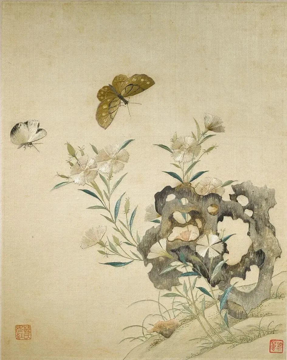其二便是略迟于缪氏的韩希孟。韩希孟是顾名世次孙媳,论辈分,她可能还要喊缪氏一声“婶母”。韩氏精通六法、擅工画花卉,潜心“画绣”,其作品意蕴可与书画相提并论,故被称为“顾绣第一人”。她的作品《宋元名迹方册》现藏于故宫博物院。《花卉虫鱼册》现藏上海博物馆。