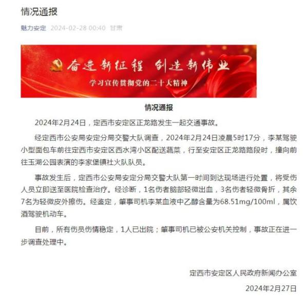 经定西市公安局安定分局交警大队调查,2024年2月24日凌晨5时17分,李某驾驶小型面包车前往定西市安定区西水湾小区配送蔬菜,行至安定区正龙路路段时,撞向前往玉湖公园表演的李家堡镇社火队队员。