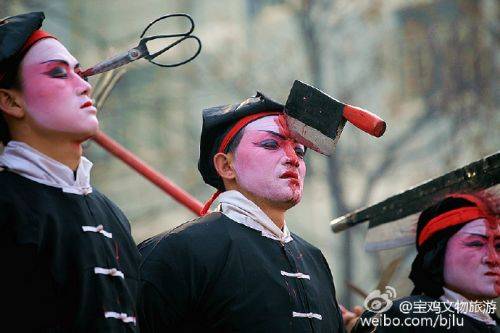 “正月初十耍社火”,血社火是陕西宝鸡地区每年正月中的一项重要文化习俗,血社火也被列入陕西省非物质文化遗产名录,宝鸡也被誉为“中国社火之乡”。“血社火”的关键是化装,据说化装一般在镇子的庙里进行,现场是保密的,门口有专人看守不准其他人靠近,而且传儿不传女。