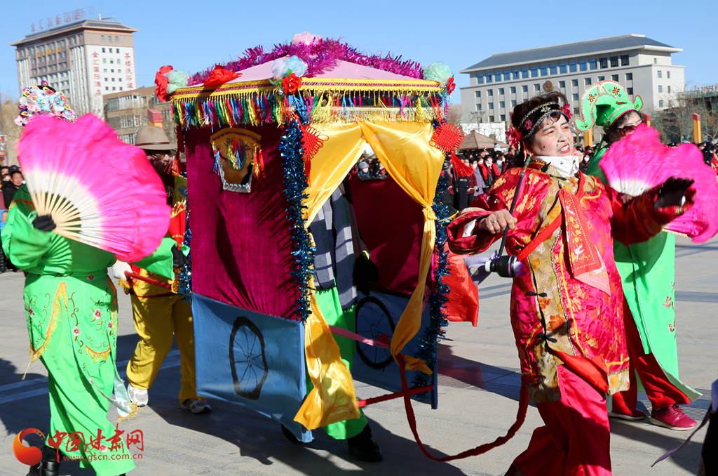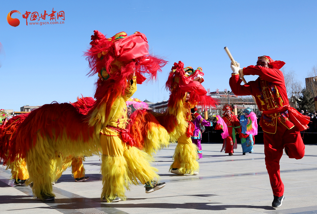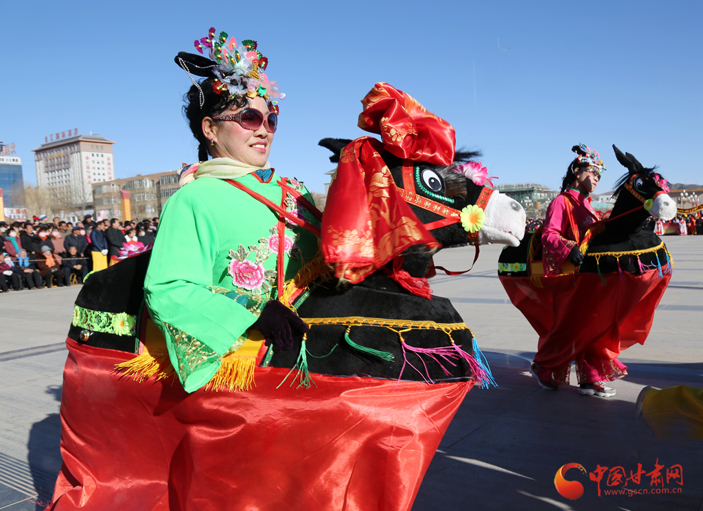 2月11日,来自金昌市永昌县的6支社火队正在为市民表演民俗节目。