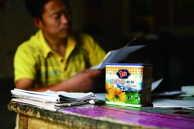 41岁的张林伟家堂屋的烛台下,压着一个方形的塑料奶粉包装盒。十年前,他的女儿蓉蓉夭折于食用该奶粉所致的营养不良。如今,盒内黄色的奶粉已经板结,形如肥皂。