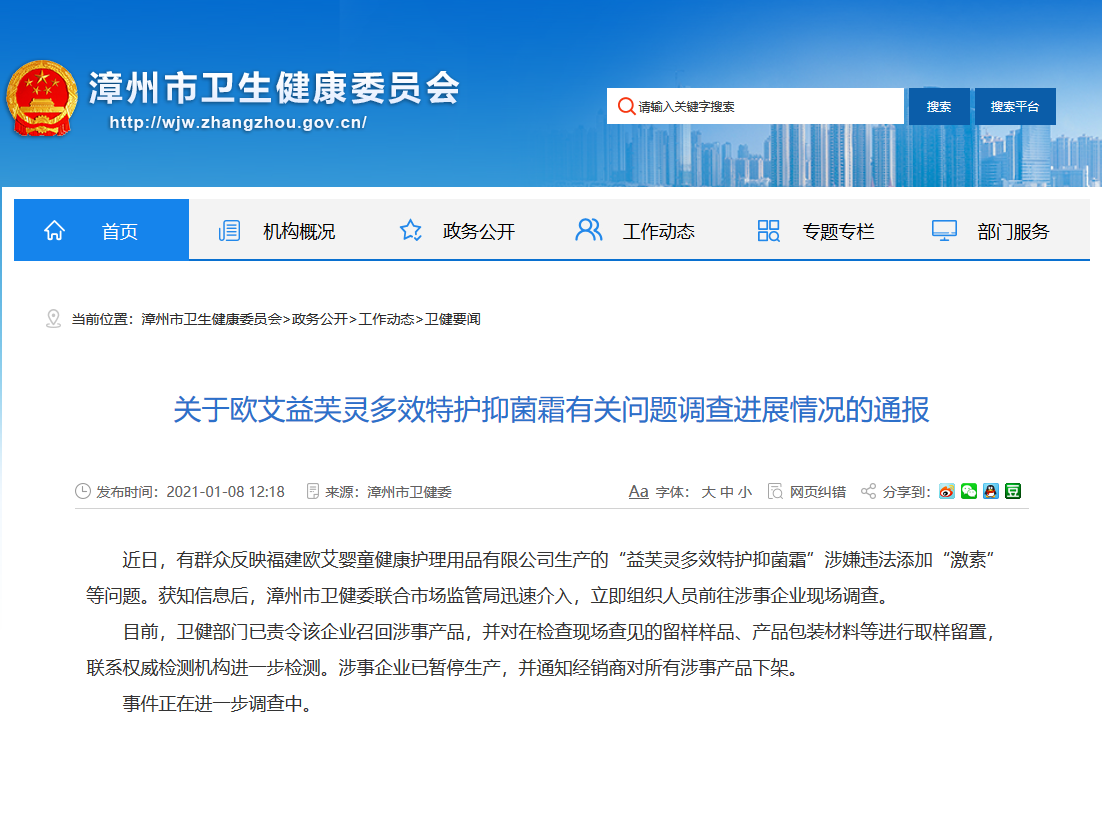 目前,漳州市卫健委联合市场监管局已经介入,立即组织人员前往涉事企业现场调查。卫健部门已责令该企业召回涉事产品,并对在检查现场查见的留样样品、产品包装材料等进行取样留置,联系权威检测机构进一步检测。涉事企业已暂停生产,并通知经销商对所有涉事产品下架。事件正在进一步调查中。