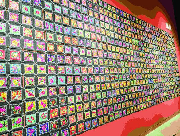 走进展厅,迎面而来的一面图片墙,是对“青绣”的介绍,让参观者特别是对“青绣”不了解的参观者有一个初步的认识。占据半面墙的枕顶是展馆内的“网红打卡地”,每一位前来观展的观众都会驻足拍照留念,“这是枕顶啊,太漂亮了,太漂亮了。”身穿汉服的北京市民刘莉莉催促朋友为自己拍下与枕顶的合影。
