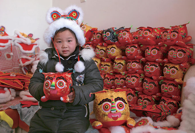 呆萌可爱的毛驴,憨态可掬的“乐乐狮”,敦实可亲的小老虎……打眼一看,这些作品大红大绿、立体形象的样子很是吸睛。