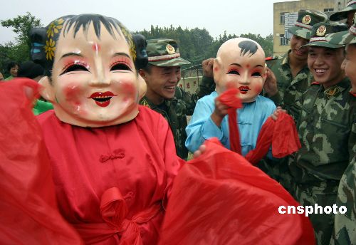 9月26日,徐州市鼓楼区的20多位老年腰鼓队员自发来到武警徐州市中队,戴起大头娃娃面具,擂响腰鼓,军民同庆喜迎中秋、国庆佳节的到来。中新社发 唐占军 摄