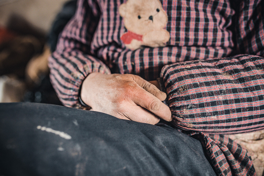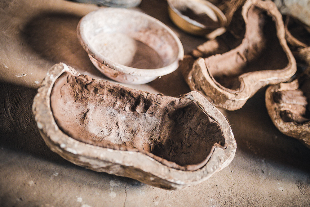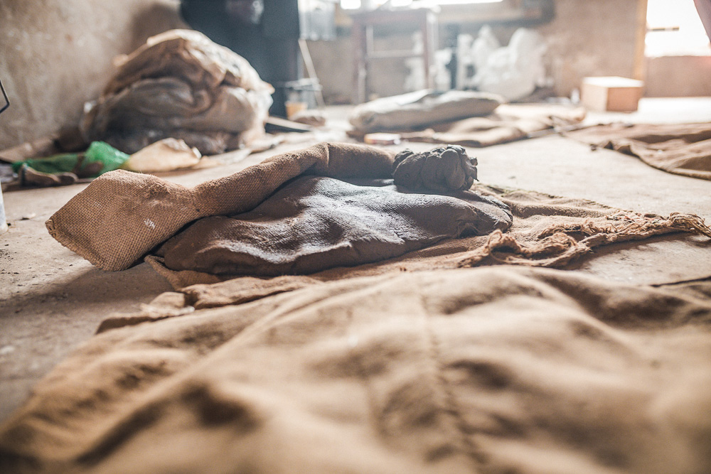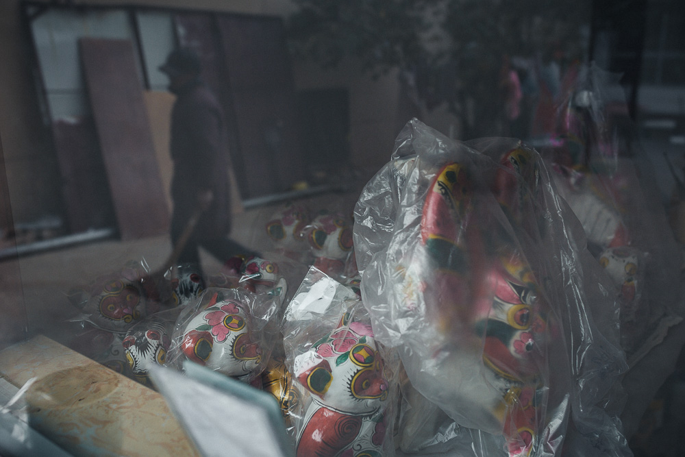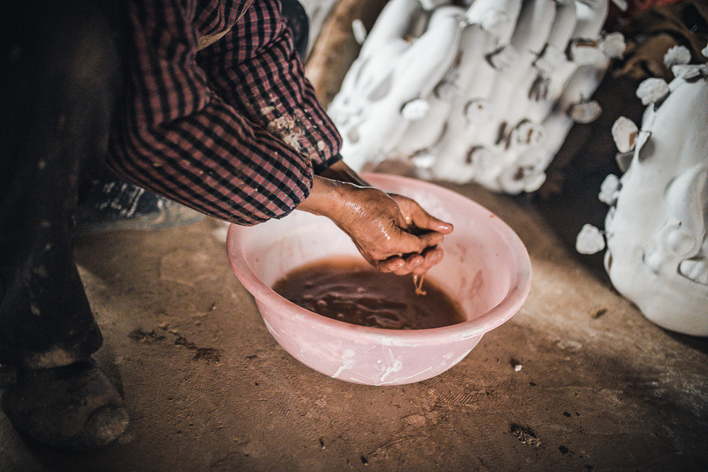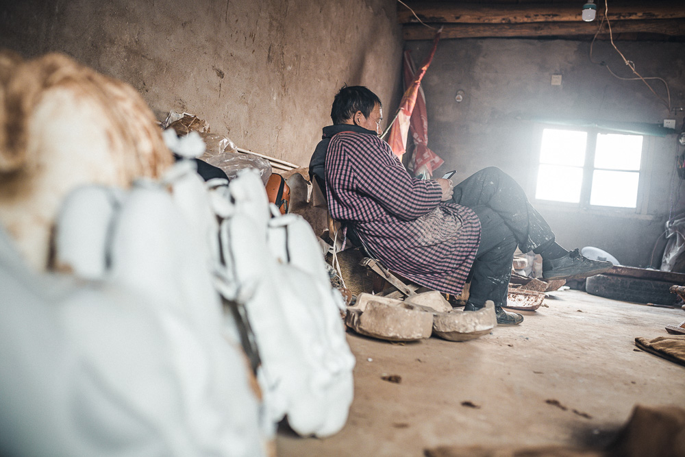 在屋子的后院正在“砸泥”的便是胡永露的弟弟,六合村附近的土叫观音土,非常适合做泥塑,因为土里没有任何杂质很纯净还有一定的油性。这样的土取回来以后会让他自然晒干。水和土会用一定比例混合,然后用锤子打压做成泥胚,这一步叫砸泥,是做泥塑的第一步。