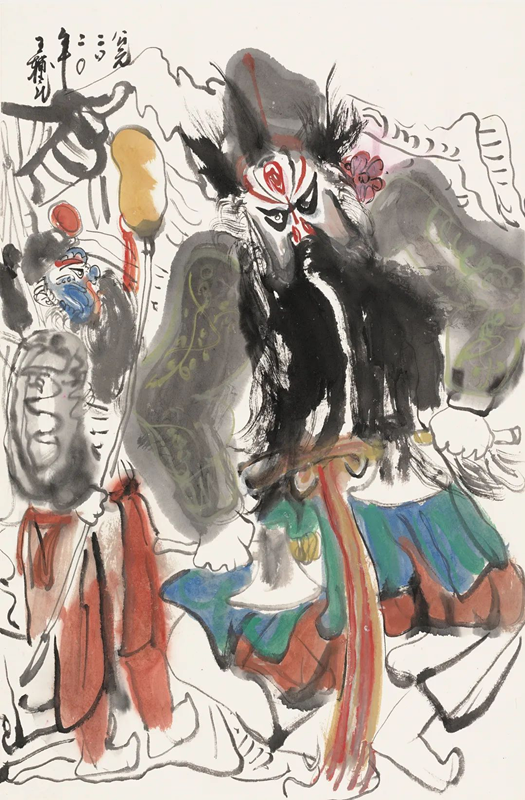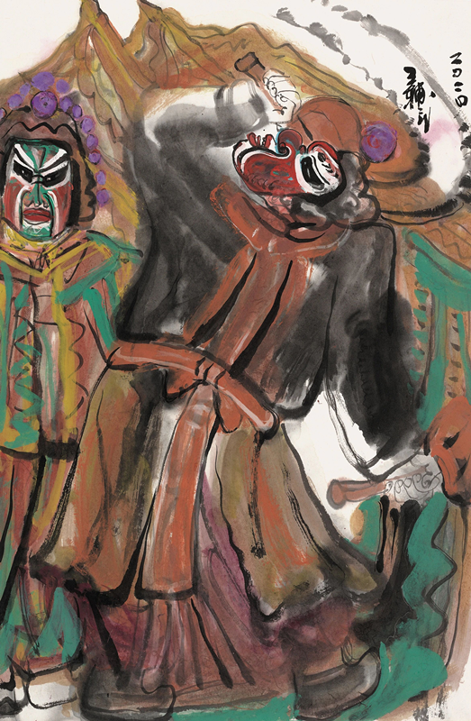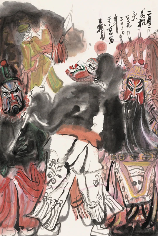 在现代性绘画的探索中,如何汲取传统因素非常重要。如毕加索的现代性观念是从非洲雕刻中转化而来,这种创作方法能否给中国画家以启发,是新世纪以来艺术家思考最多的问题。王辅民即是以这种创作思路来探索和挖掘中国画的现代性,因此,他选择取材于西北甘肃一代的民俗风情。社火是在传统节庆时节,带上面具、穿上戏服、上街游走的一种狂欢行为,也是一种祭天、祭地、祭神的仪式,是为了祛邪辟恶、保佑一年五谷丰登的祭祀活动。毫无疑问,社火活动带有一定的神秘诡异色彩,而王辅民作品的现代性就体现在神秘性上,并与原始社会聚会扮兽庆贺中所体现的人的意识紧密相联。所以,他的作品内涵并非是通过画面的平面构成和形式语言来表达现代人的视觉经验,而是在追求的神秘意识中把对人的表现以及传统文人画的笔墨有机结合。因此,王辅民的创作和探索方向即是在这两者之间寻找平衡,这也是他在艺术追求上的基本立意与思考。当然,在具体的创作过程中,如何表现社火活动中穿着戏服的人物形象,我认为王辅民画得十分巧妙。他的作品具有强烈的现代感,有效地改变了我们的视觉经验,图像内容表面上看是带着夸张或放大面具的人像,而实际上则是把现实中的人物画成了戏剧中的人物,或是把现实中的人物和戏剧中的鬼神结合起来,以致我们在日常生活中看到的人物形象和生活形态,都与他在社火中表现的人、鬼、神之间构成了一种特有的对应关系,使得画面中蕴含了一种深刻的哲学意味。王辅民的笔墨既追求传统文人绘画的潇洒逸度,又追求毕加索描绘非洲雕刻时出于偶然的荒诞与变形,致使他的画面中形成了一种离奇与精致、粗放与细微的强烈对比,有效地传递了现实与非现实、人与鬼神之间的意识变换,实现了现代性绘画的释放与突破。