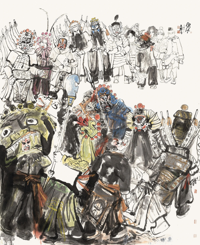 王辅民早期的写实人物画训练为其之后的艺术生涯打下了坚实的笔墨功底,从近年来创作的“社火”系列作品看,他坚持以基层民众的生活状态为出发点,找到了一个既恰到好处又痛快淋漓地叙述个人精神理想的契合点。王辅民将自己的视域范围框选在土生土长的生活环境中,并提炼出了热气腾腾的创作元素,甚至透过画面就能感受到西北民间的乐器旋律和戏人唱腔,由内而外地散发着一种乡土化、纯天然、接地气的民族文化生态。