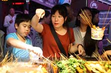 当下正值暑期旺季,立秋后的宁夏夜晚凉爽怡人,在银川怀远夜市,来自全国各地的游客和本地市民络绎不绝,夜市里“烟火气”升腾,银川“夜经济”在火热中不断绽放。新华网 张洁龙 摄 市民游客在怀远夜市的小吃摊位前挑选特色美食辣糊糊。