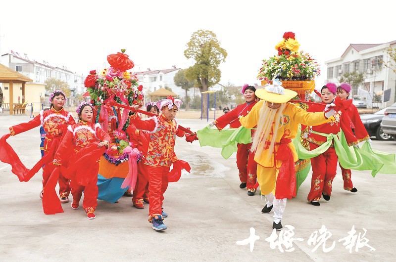 年前腊月二十八,十堰市郧阳区城关镇红桥村广场上,敲锣打鼓吹着唢呐,伴随着欢快的曲调,大小两只彩船舞起来,表演者是一老一少两支队伍,老的是村里的大爷大妈们,少的是一群娃娃们,他们在为春节期间的表演作最后的彩排。“采莲船”是市级“非遗”项目,又叫“跑旱船、玩船灯”。船中有一女子扮成“采莲女”,手扶船栏,如坐船姿势,随器乐伴奏边走边唱边舞;船头有一男子扮成“梢公撑篙”,牵引船只跑圆场或作荡船状;船尾有一丑角扮成“摆梢婆子”,手握扇子随船而行;船左右各由两到三名女子扮演“丫环”,手拿彩绸翩翩起舞。