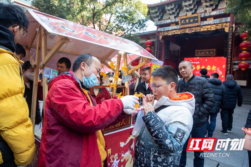 大戏台上,舞狮、杂技、长沙弹词等民俗表演轮番上演,台下掌声与叫好声此起彼伏。一旁的集市里,琳琅满目的各色摊位一次排开,既有吹糖人、捏面人、湘绣等非遗技艺,也有热气腾腾的长沙小吃。无论是本地居民还是远道而来的游客,都能感受到浓浓的年味和温馨的人情味,共同享受这个属于春节的独特魅力。