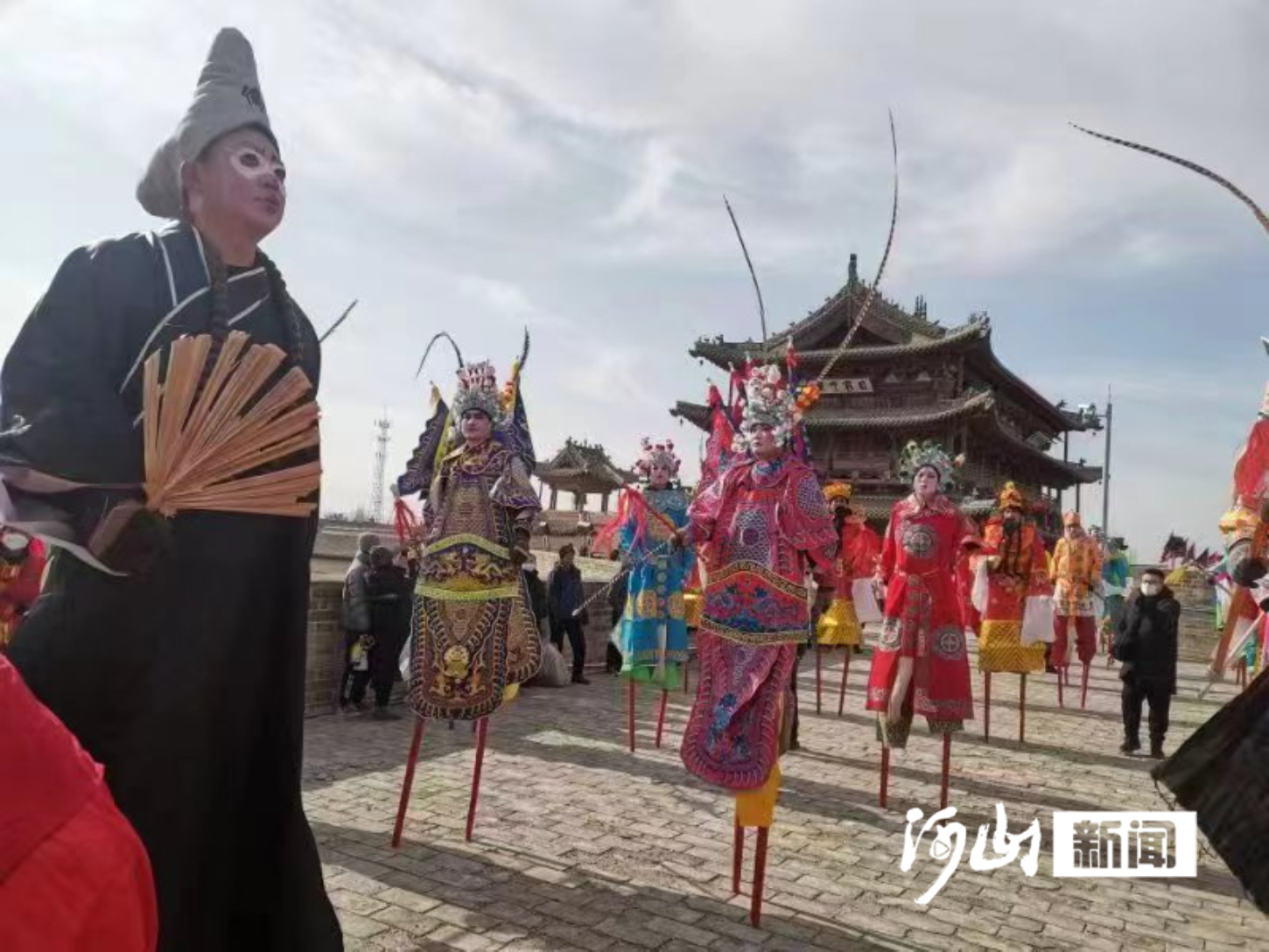 历史久远的蔚州古城墙之上,踩高跷、舞龙斗狮、划旱船、扭秧歌……蔚州镇几个村的社火队带来了形式多样的民俗表演,节目精彩纷呈,气氛欢快喜庆。居民游客欢聚古城,共同感受着传统的年味。