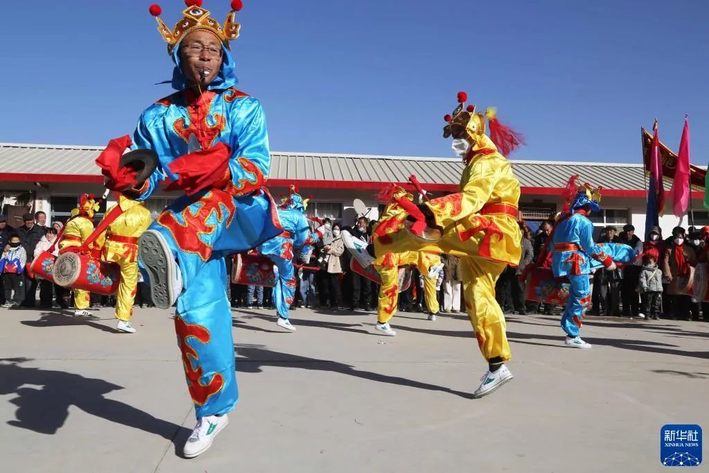 1月6日,甘肃省定西市安定区内官营镇万崖村社火队演练传统社火节目。新华社发(王克贤 摄)