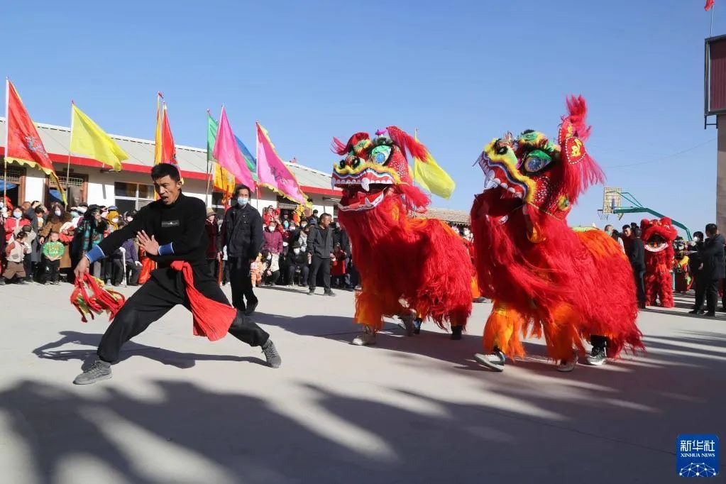 1月6日,甘肃省定西市安定区内官营镇万崖村社火队演练传统社火节目舞狮。新华社发(王克贤 摄)