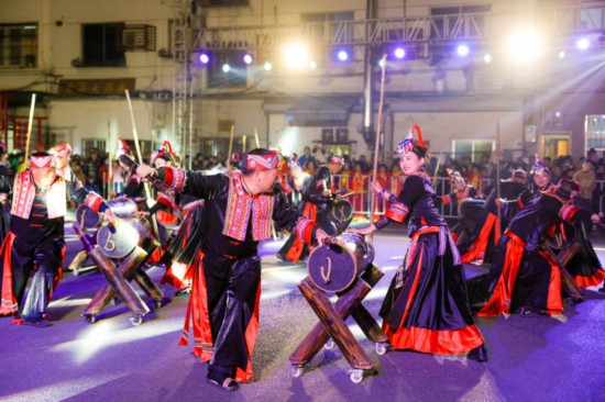 当天晚上6点,台上锣鼓威武,金狮舞动,热闹的开场一下子点燃了现场喜庆的节日氛围。章村镇郎村村的十几位畲族村民围绕着木鼓,携手成圈翩跹起舞,为现场观众带来极具特色的民艺节目《响木舞》。作为浙江省级非物质文化遗产,《响木舞》是反映畲乡人生产生活的一种传统舞蹈,表达着对祖先的敬仰,对未来美好生活的期盼,并通过言传身授的形式传承至今。