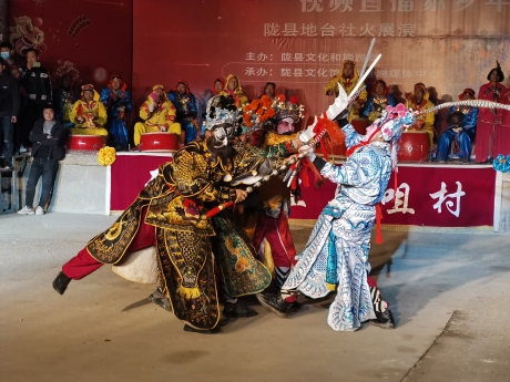 三秦都市报—三秦网讯(梁会平)2月9日晚,历正月初九,民间社火之乡的陇县网络直播了天成镇王马咀村地台社火,《关公刀》《三英战吕布》《黑虎搬三宵》等经典社火剧目接连上演,让全国各地网友足不出户大饱眼福。据不完全统计,当晚共有600多万网友目睹了陇州社火的独特魅力,感受到浓浓的年俗。
