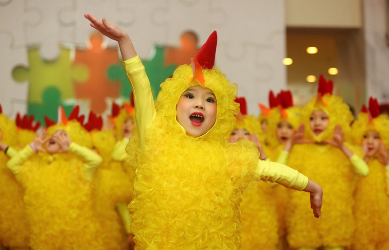 1月7日,小朋友装扮成小鸡的模样表演开场舞蹈。