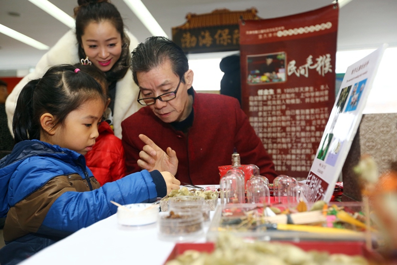 1月7日,小朋友在民间艺人的带领下体验“天津毛猴”的制作。