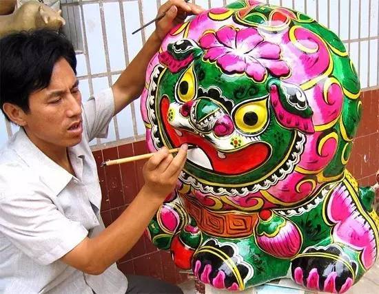 上色,最能看出一个人的细心与否。一般先上大红与绿色,然后再施之以玫瑰红,最后上黄色提亮,眼、鼻、口则需小笔细细描摹,力求细致入微,色彩涂布完毕后阴干,待颜色干透以桐油覆盖防水,现代多以清漆替代。