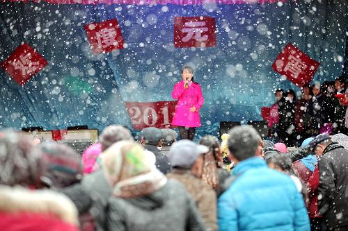 3月4日,社火队队员在雪中演唱秦腔。新华社发(杨昕 摄)