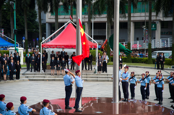 10月1日,澳门特别行政区政府在金莲花广场举行升旗仪式。新华社记者 张金加 摄