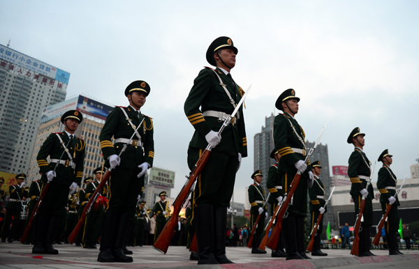 10月1日,兰州市庆祝新中国成立65周年升国旗仪式在东方红广场举行。 新华社记者 张锰 摄