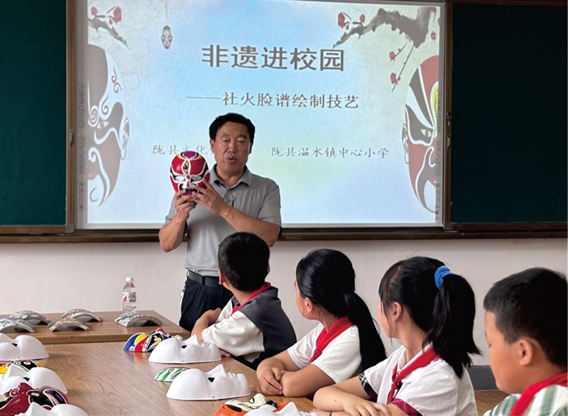 2019年6月,少年宫邀请陇县社火脸谱非遗传承人为学生指导脸谱绘画。孩子们兴趣盎然地在瓦片、葫芦、马勺等器物上画出一幅幅栩栩如生的脸谱。2024年6月,少年宫邀请市级社火疙瘩脸谱传承人杨秉权老师进入校园为孩子讲解陇县社火的艺术形式,有河北镇的连枷社火、城关镇北坡村的挈社火、东南镇的疙瘩脸社火和血社火以及全县风靡的步社火等,让孩子们领略这种集美术、戏曲、打击乐、武术等为一体的艺术形式的魅力。