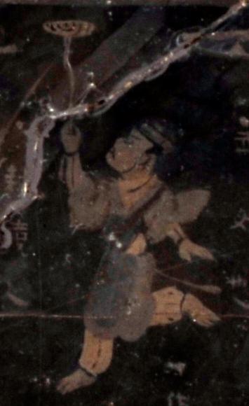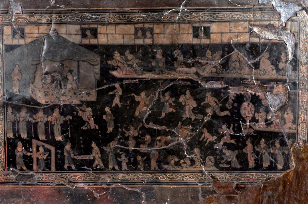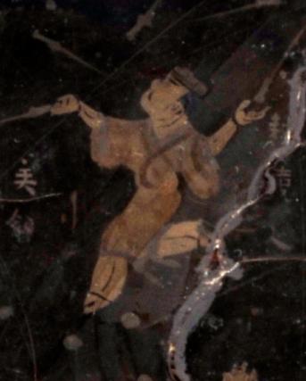 乐舞百戏最早见于两汉时期的墓葬,这个主题还延续到之后的朝代。孙吴大将朱然的墓中出土了一件漆盘,盘中绘有一幅宴乐图,其中也有百戏内容,并且画宴乐图的画匠还很贴心的为每种百戏附上榜题(其实就是说明牌啦)。