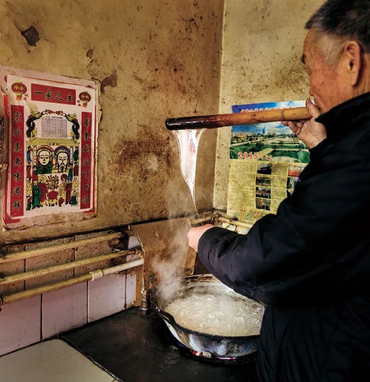由于自己加工糖稀工序多、周期长,现在我们都是在市场上舀回糖稀后,用大火烧滚后再用文火慢慢熬出水分,擀杖搅、铲子铲,两三个小时后,等糖稀变得黏糊、能拉出丝了(冷却后能弹断,1 斤糖稀能熬出六七两成品),先倒在铁盆里冷却一会儿,再倒在用砖砌成、里面铺着塑料纸(铁盆内、塑料纸上要先抹上油,糖稀凉后不黏)的小方池中,冷却变硬后收藏起来。每次出摊的时候,就带上几块,用的时候拿小锤子敲下一些,放在糖锅中十字形的4 个小方格内(过去也用3 个方格锅),加热变稀后,分别加入红、绿、黄3 种食用色素(另一方格内为淡黄色的糖稀原色)。