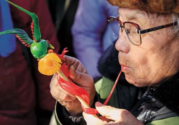没有老师,我就跟着各种动物跑,仔细观察它们的特点。出去游乡,看见谁家的房脊上、门匾上有好看的动物形状或花鸟图案,我就放下挑子现场吹捏,一次不行两次,直到弄像为止。我还买了红、绿、黄几种食用色素,搭配起来花红叶绿、五颜六色很吸引人。几年下来,我在内容、形式、色彩上都有了不小的突破,十二生肖、花卉虫鸟就成了我的拿手活。那时候人都没钱,铜锣一响,孩子们围过来,用碎铜烂铁、牙膏皮、皮绳头、麻绳头、鞋底子、头发、红薯、萝卜换糖人,早上出去挑的担子轻,晚上回来时担子压得走不动路,我腰疼的病根就是那时落下的。
