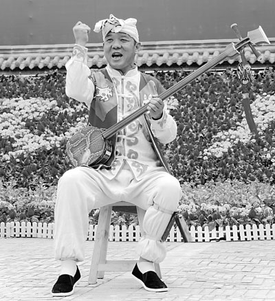 二○一六年十月十四日,国家非物质文化遗产传承人高永厚在陕西延安梁家河村表演陕北说书《刮大风》。柴如瑾摄/光明图片